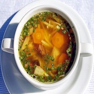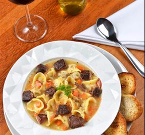 capeletti de carne com caldo de carne , legumes e carne em cubinhos,
