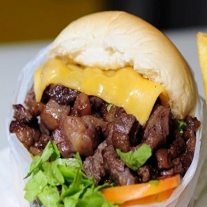 ALCATRA , CEBOLA , QUEIJO, PRESUNTO , TOMATE , MAIONESE E PÃO DE HAMBURGUER