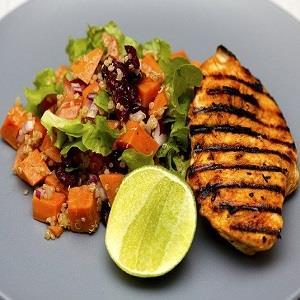 Frango em cubinhos , arroz e legumes .